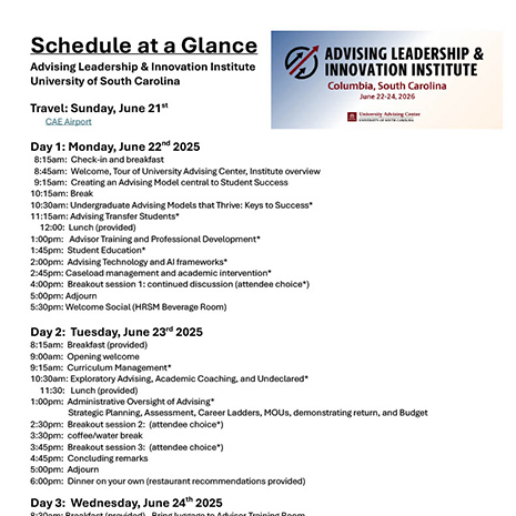 Interested in attending the Advising Leadership & Innovation Institute June 22-24, 2026 in Columbia, SC? Complete the interest form below to receive updates and targeted communication once registration is live.
